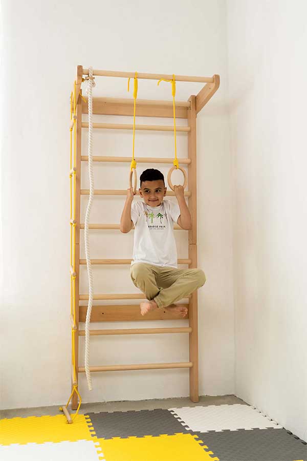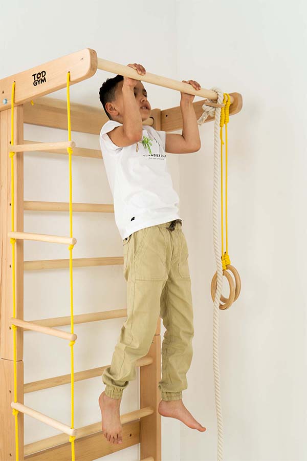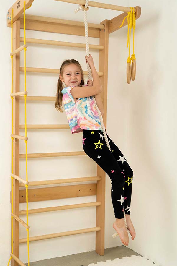 Regular activities on the Swedish Wall Bars Set aid in the overall harmonious development of children, strengthening their nervous system and immunity, leading to improved overall health. Moreover, these activities instill discipline, build character, nurture a habit of a healthy lifestyle, and foster willpower, goal-setting abilities, and the determination to achieve them.